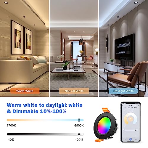 2 Inch Smart Recessed Lighting, 6 Pack WiFi Black LED Downlight 5W 120V, Dimmable RGBCW 2700-6500K Color Changing, Compatible with Alexa/Google, Ceiling Lights with LED Driver