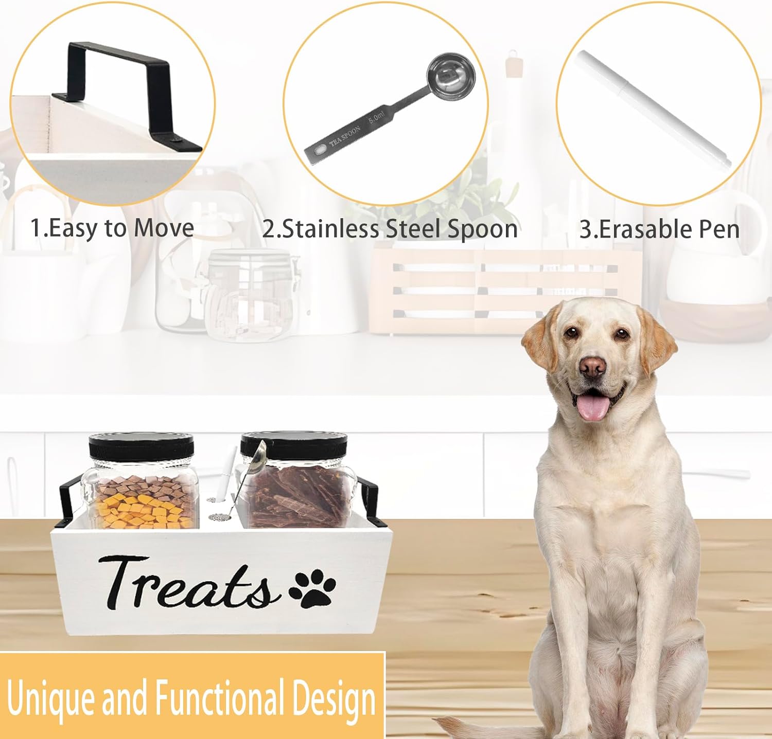 Stylish and Functional Design: This Dog Treat Holder is not only practical but also adds a touch of farmhouse decor to your home. Crafted from solid wood, it blends seamlessly with any interior style, making it an attractive addition to your kitchen or pantry.