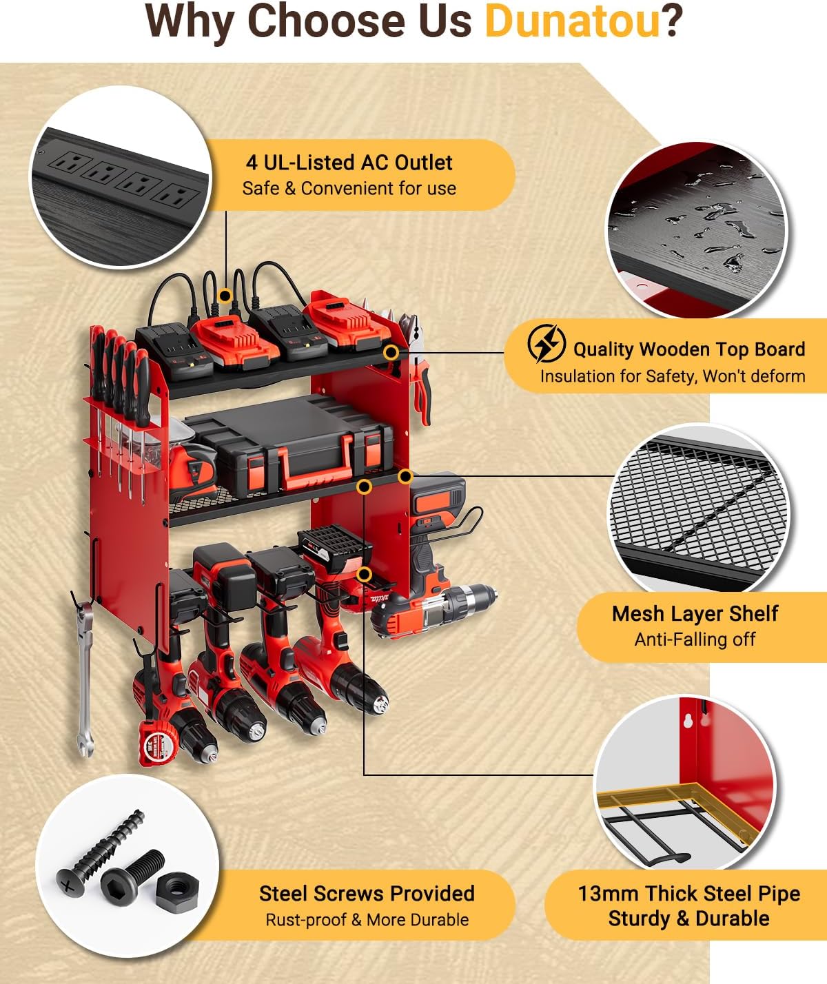 [Convenient & Safe] – The top built-in 4 AC sockets conveniently provide power for appliances or batteries, eliminating the need for additional socket purchases. The sockets are UL certified, and the wooden top shelf provides insulation for safe usage.