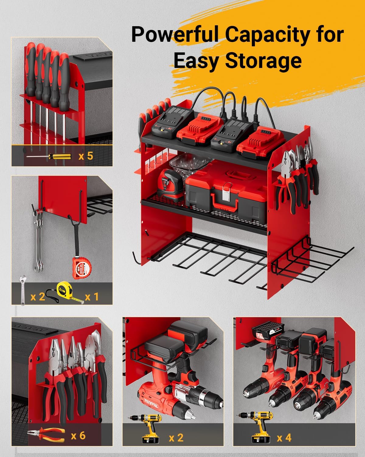 1 Adjustable Tool Organizer 2 Convenient Charging Strip 3 Sturdy Tool Storage Rack