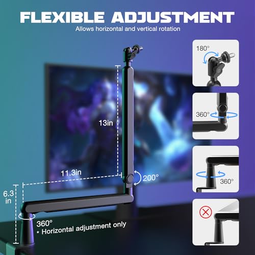 [Fully Adjustment] Suspension arm stand can also be extended to 29 inches, suitable for your long large place of work desktop. The boom arm can also be adjusted up to down by 220 degrees, and horizontally by 360 degrees. More angle adjustments provide more usage options. Tips:The section which near the C-clamp cannot be adjusted up to down