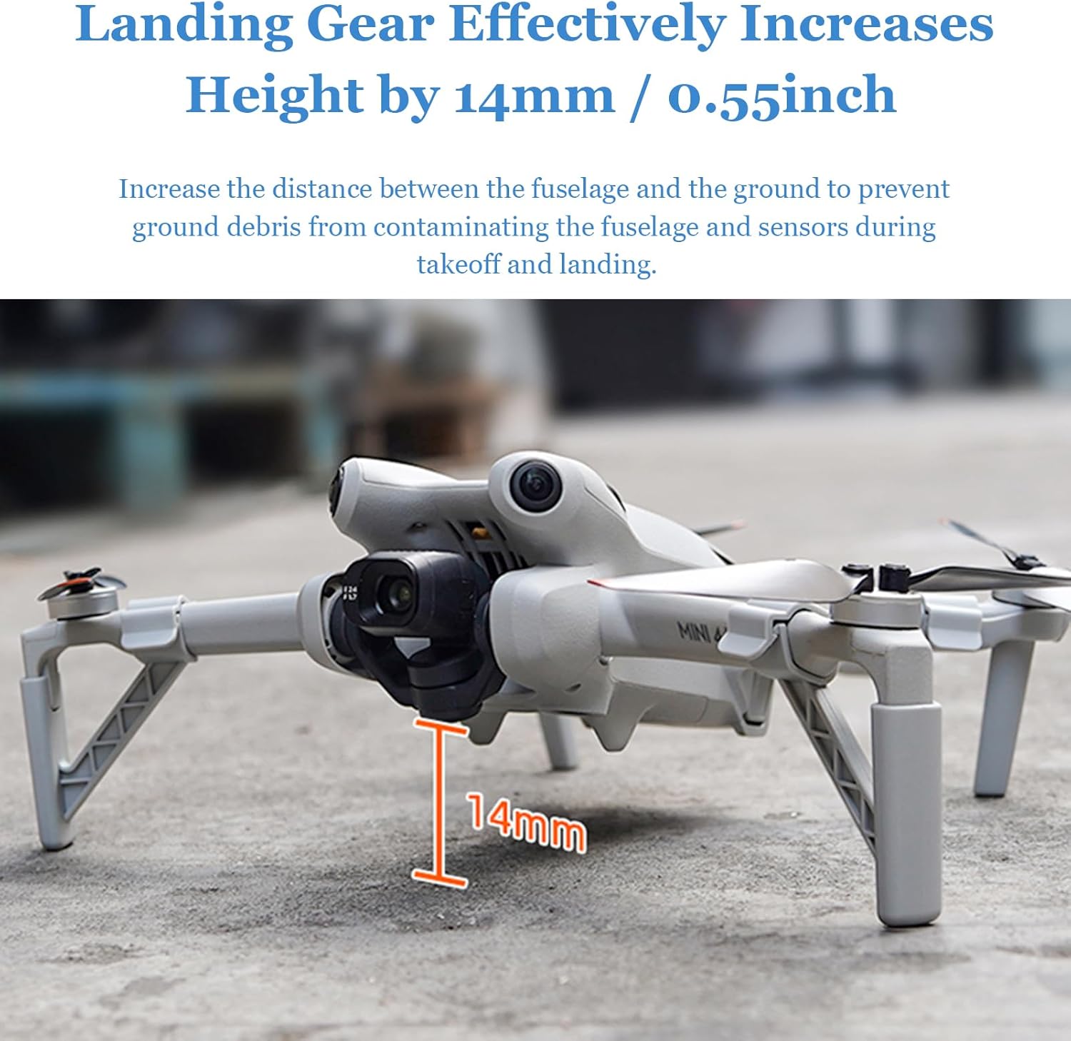 【Heightened Landing Gear】The landing gear effectively increases the height of the drone by 14mm, effectively preventing ground debris from contaminating the aircraft body or damaging the gimbal and body during takeoff and landing.