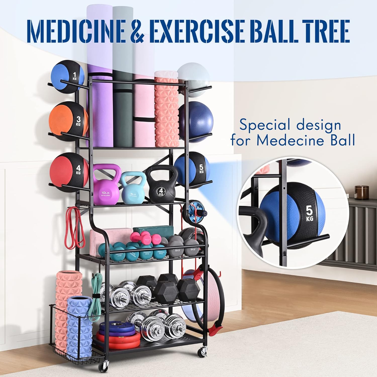 【3-Tier Medicine Ball Tree Design】: The top medicine ball rack is made with sturdy steel tubing, which offers exceptional strength and stability, holding up to 6 medicine balls( 2lb to 20lb weight ).
