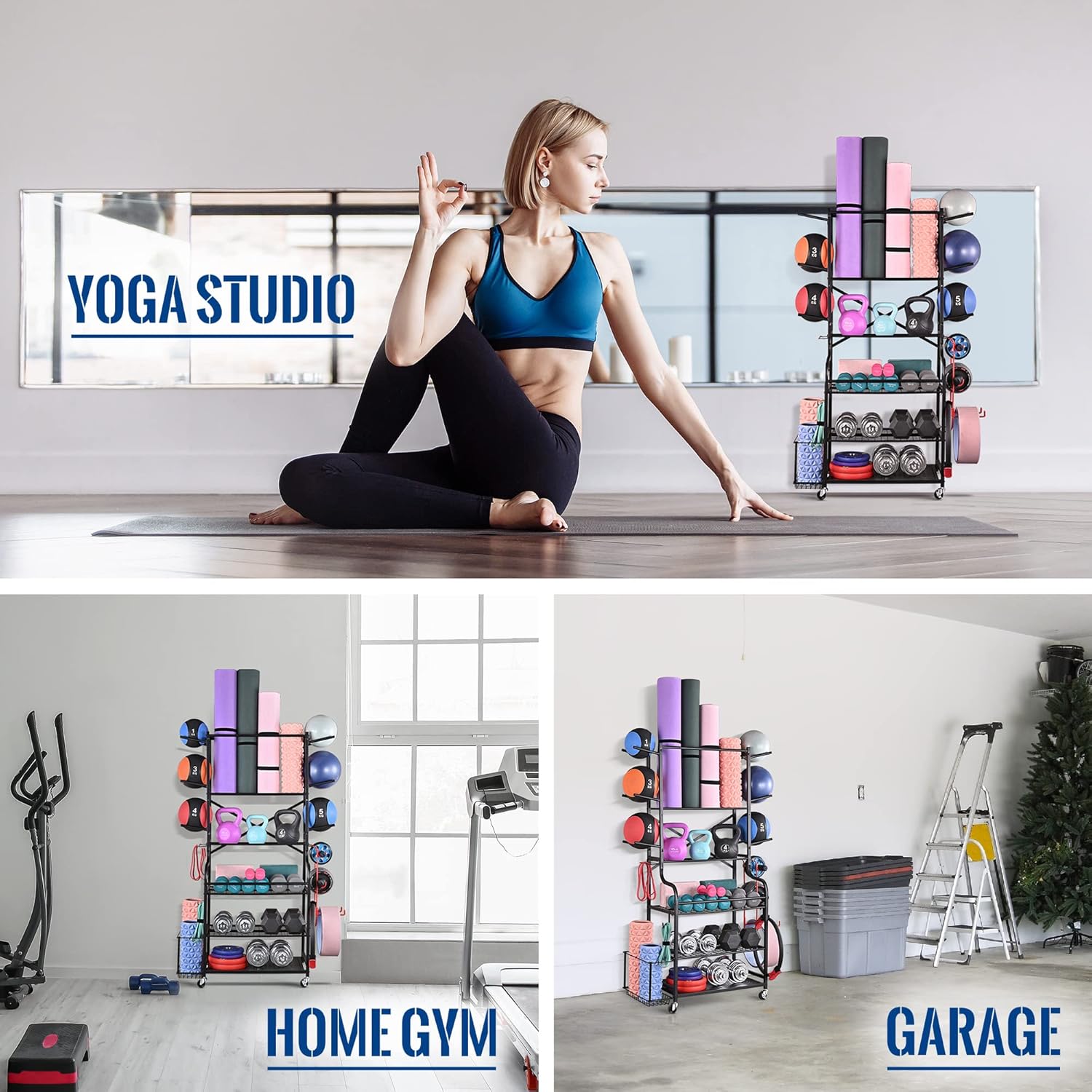 【All-In-One Home Gym Storage Rack】: This weight storage rack was main combine with a top shelf which can hold the yoga mats and medicine ball.And a bottom rack is for weight equipment. This design can make your space much cleaner and all your exercise stuff in one place.